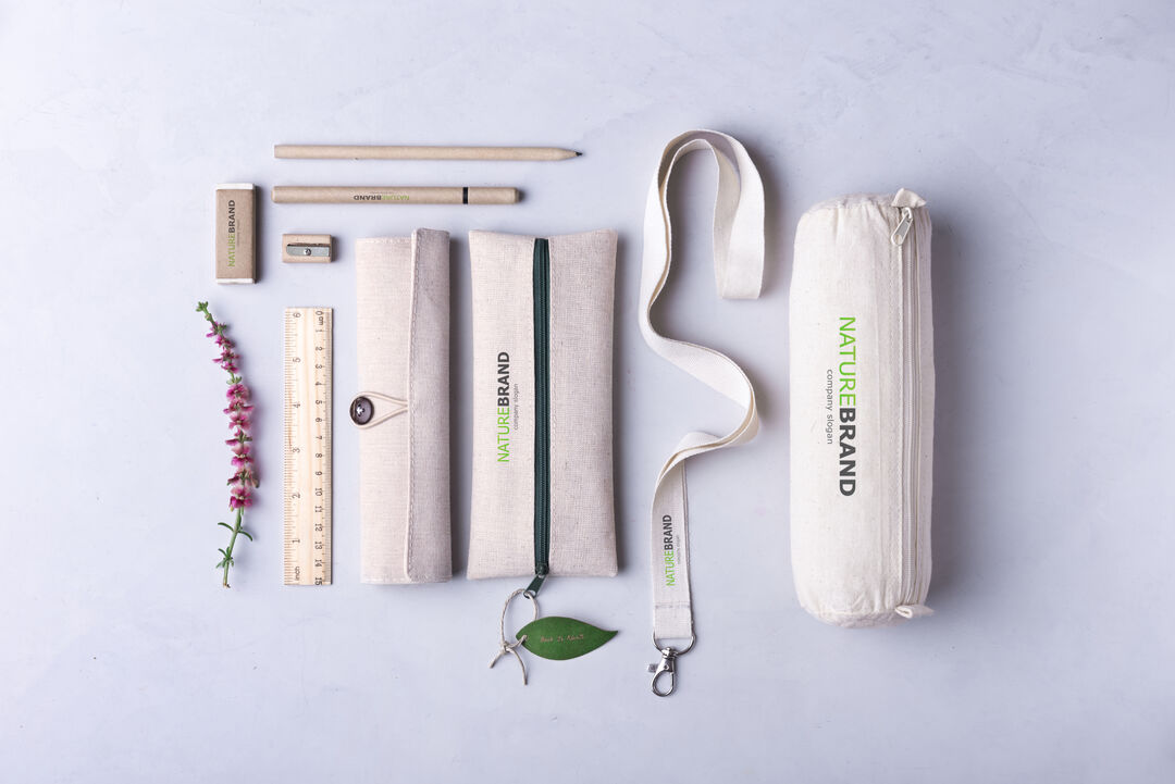 Info: Originale astuccio della linea natura. Realizzato in juta e cotone, con elegante chiusura a bottone. Contiene 5 pezzi dalla finitura naturale: gomma, temperamatite e penna in cartone riciclato, con matita e righello in legno.