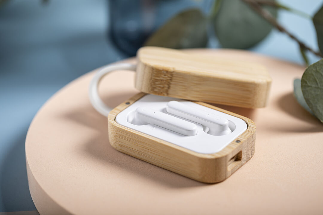 Info: Auricolari della linea nature, con connessione Bluetooth® 5.0 e batteria al litio. In elegante finitura bianca e confezionati in una custodia di bambù con funzione di caricatore. Progettate con design ergonomico, includono un pulsante di controllo a sfioramento integrato nella cuffia, con una base di ricarica corrispondente e una luce di stato di carica a LED. Funzione vivavoce e ricaricabile, con cavo micro USB incluso. Confezionato in un'attraente scatola di design ecologico nbsp