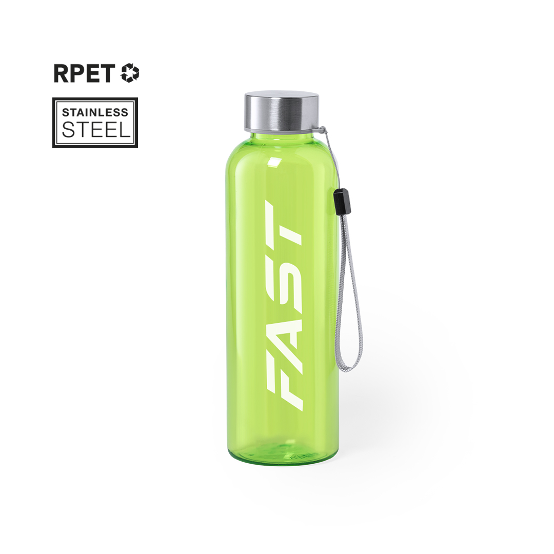 Info: Borraccia in RPET, capacità 600 ml, senza BPA. Tappo a vite in acciaio inox, con laccio per il trasporto. Disponibile in un'ampia gamma di colori.Realizzato in plastica riciclata, per incoraggiare il riutilizzo dei rifiuti plastici e contribuire alla sostenibilità del pianeta".