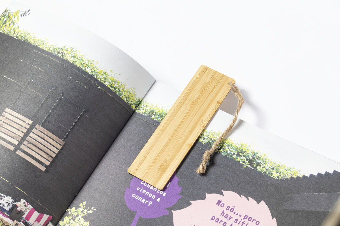 Originale e robusto segnalibro della linea natura, realizzato in bambù con cordoncino di juta.