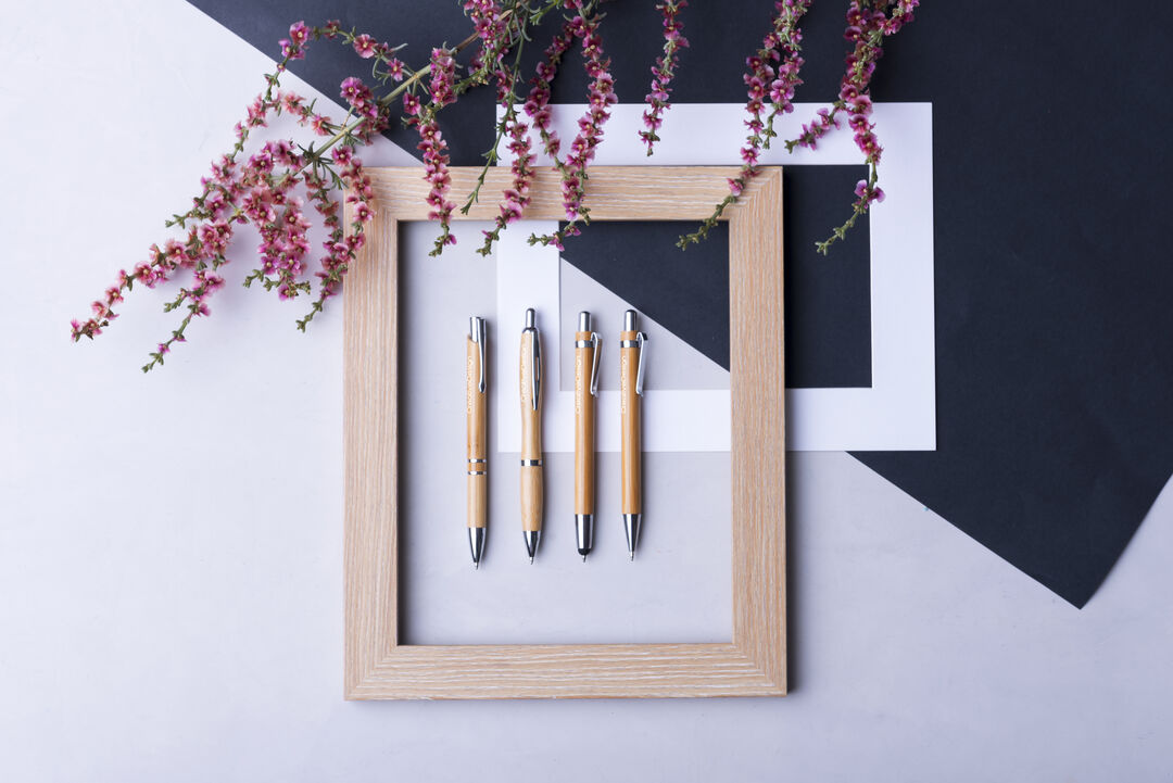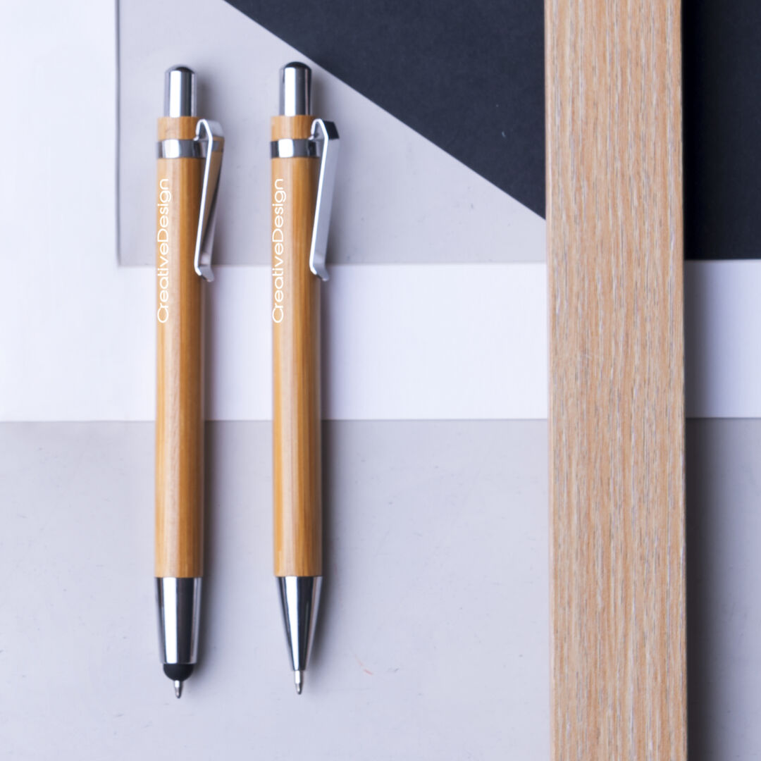 Elegante biro con meccanismo a pulsante, fusto in legno di bambù naturale e finiture in argento lucido metallizzato.